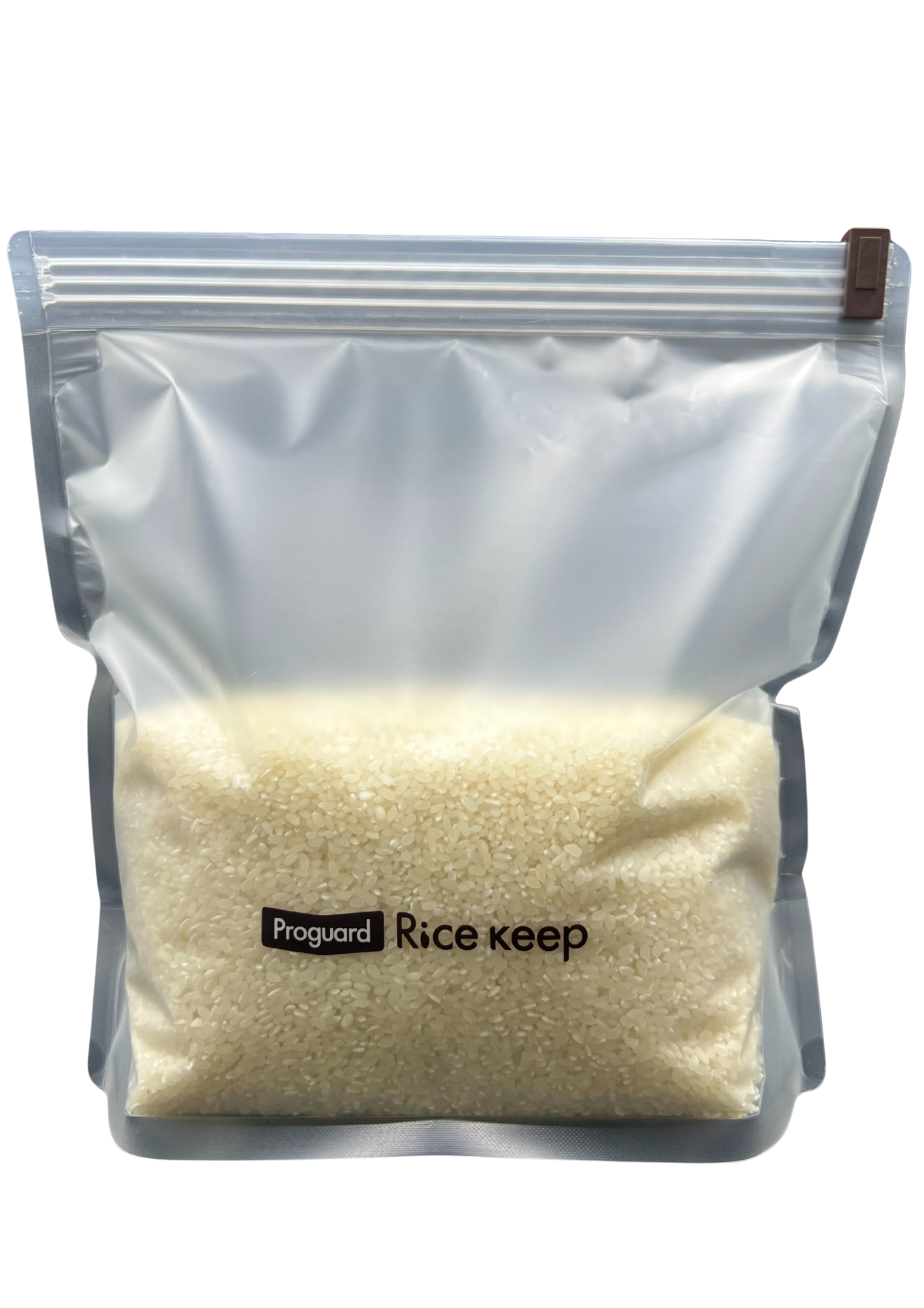 プロガードライスキープは、家庭で手軽にお米を長期間保存できる、新しい保存袋です。お米の劣化にかかるほぼすべてのストレスをブロックし、常温で最長3年間お米の鮮度を保つことができます。虫やカビ、紫外線、さらにはニオイ移りをしっかりと防ぐため、新米本来の風味を存分に楽しむことができます。繰り返し使えるエコ設計により、冷蔵庫に頼ることなく、新米の状態を維持できます。